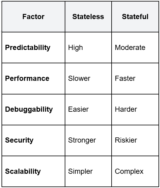 - Stateless systems are easier to scale, debug, and secure